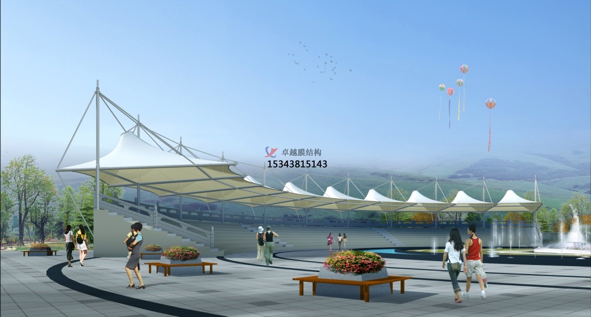 索膜結(jié)構(gòu)看臺(tái)景觀應(yīng)用場(chǎng)景:其應(yīng)用場(chǎng)景廣泛,可在教育領(lǐng)域、公共空間、商業(yè)與文旅等場(chǎng)景使用。在教育領(lǐng)域內(nèi),學(xué)校操場(chǎng)看臺(tái)提供遮陽(yáng)避雨功能,適用于運(yùn)動(dòng)會(huì)、升旗儀式等集體活動(dòng),其開(kāi)放結(jié)構(gòu)增強(qiáng)空間互動(dòng)性,為師生提供舒適的觀看空間,也為校園增添了現(xiàn)代化的景觀元素;在公共空間,城市公園、廣場(chǎng),作為休憩亭或藝術(shù)裝置,提升景觀趣味性與實(shí)用性,由于其大跨度覆蓋看臺(tái)及賽場(chǎng),無(wú)立柱設(shè)計(jì)保障視野開(kāi)闊,輕量化結(jié)構(gòu)提升抗震性等特性,尤其適合在體育場(chǎng)館應(yīng)用;在商業(yè)與文旅中,商業(yè)街區(qū)臨時(shí)展區(qū)、景區(qū)廊亭等,通過(guò)膜結(jié)構(gòu)打造標(biāo)志性視覺(jué)焦點(diǎn),吸引人流并承載多功能需求,同時(shí)與自然景觀相融合,成為景區(qū)的一道亮麗風(fēng)景線(xiàn)。