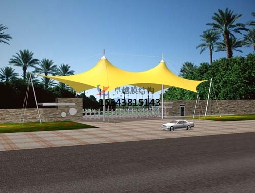 (4) 張拉成型是整個膜結(jié)構(gòu)工程施工的重要環(huán)節(jié),施工項目能否取得效果,取決于張拉是否滿足設(shè)計要求。當(dāng)支承結(jié)構(gòu)為剛性邊界時,預(yù)應(yīng)力的施加要通過特殊的構(gòu)造來實施。對于柔性邊界,可通過調(diào)整撐桿的位置來調(diào)節(jié)預(yù)應(yīng)力的大小。張拉索膜結(jié)構(gòu)中,膜材的張拉預(yù)應(yīng)力是靠索提供的。整個張拉過程實際就是將各種索按照預(yù)定的應(yīng)力張拉到位。張拉時應(yīng)確定分批張拉的順序、量值,控制張拉速度,并根據(jù)材料的特性確定超張拉量值。張拉過程可以是分批、分級調(diào)整索的預(yù)應(yīng)力,逐步張拉達(dá)到設(shè)計值;也可以對整體實施同步張拉。對有控制要求的張力值應(yīng)作施工紀(jì)錄,成睿Q195 景觀膜結(jié)構(gòu)遮陽棚對無控制要求的也要作張拉行程紀(jì)錄。