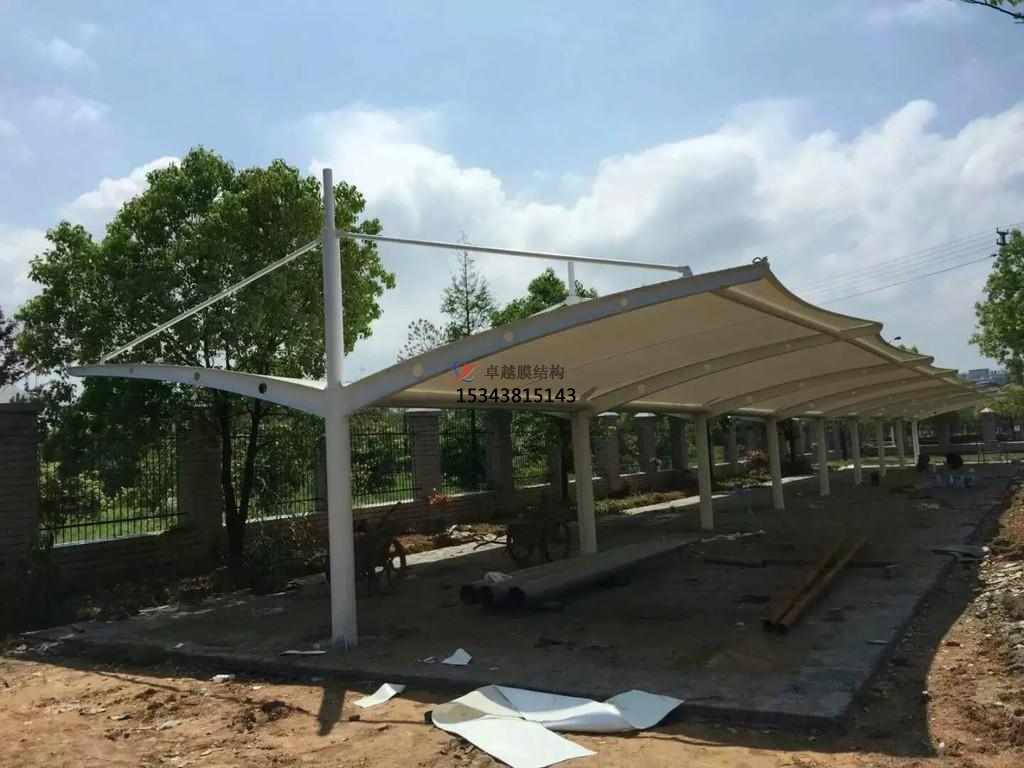 種,張力式膜結(jié)構(gòu)。這種類型的膜結(jié)構(gòu)是采用相對簡單的材料制作而成的,同時由于這種膜結(jié)構(gòu)本身具有一定的張力,因此稱為張力式膜結(jié)構(gòu)。與傳統(tǒng)的膜結(jié)構(gòu)有所差異的是,主要有兩種柔性材料構(gòu)成它的受力材料,即薄膜和索。在對膜結(jié)構(gòu)進(jìn)行工程設(shè)計之前我們必須先要了解一下它的組成材料,一般來說,使用在建筑工程上的薄膜材料主要有織物類以及非織物類兩種。前者比較常用的一般主要是PVC膜材以及PTFE膜材,而比較常用的ETFE膜材是在在所有非織物類的薄膜材料中具有代表性的。而不同場地使用的停車棚因為其要求也不同,所以對選擇的膜結(jié)構(gòu)的功能以及設(shè)計壽命都有所區(qū)別。