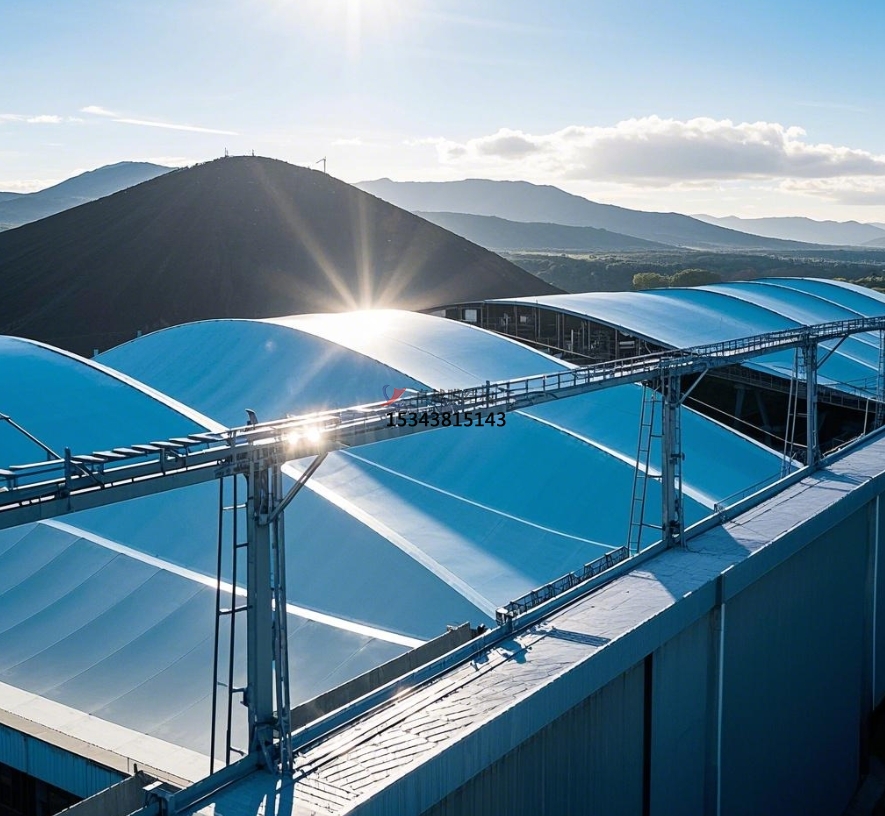 另一種常見的是骨架式膜結(jié)構(gòu),如首鋼水城鋼鐵原煤堆場(chǎng)環(huán)保封閉煤棚工程,采用網(wǎng)架結(jié)構(gòu)作為骨架,膜材覆蓋其上。沿網(wǎng)架結(jié)構(gòu)縱向 10 米高處設(shè)置防風(fēng)抑塵網(wǎng),既保證了內(nèi)部通風(fēng)需求,又將露天的煤炭集中存放 。