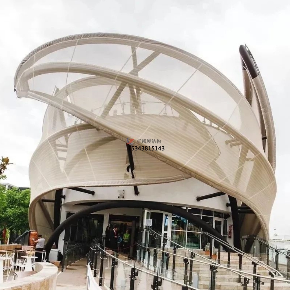 膜材是在聚酯纖維編織成的基布上涂敷PVC(聚氯乙烯)樹脂而形成的復(fù)合材料,非常的具有技術(shù)含量,其曲面可以隨著建筑師的設(shè)計(jì)需要任意變化,結(jié)合整體環(huán)境,建造出標(biāo)志性的形象工程。