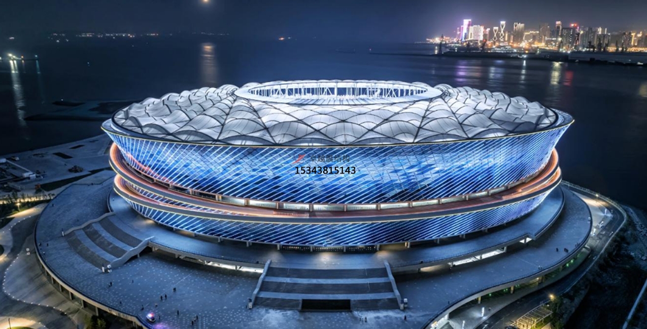 2022年,大連梭魚灣體育中心,立面使用德國NOWOFOL ETFE 9種不同藍色彩膜,頂面內圈使用透明