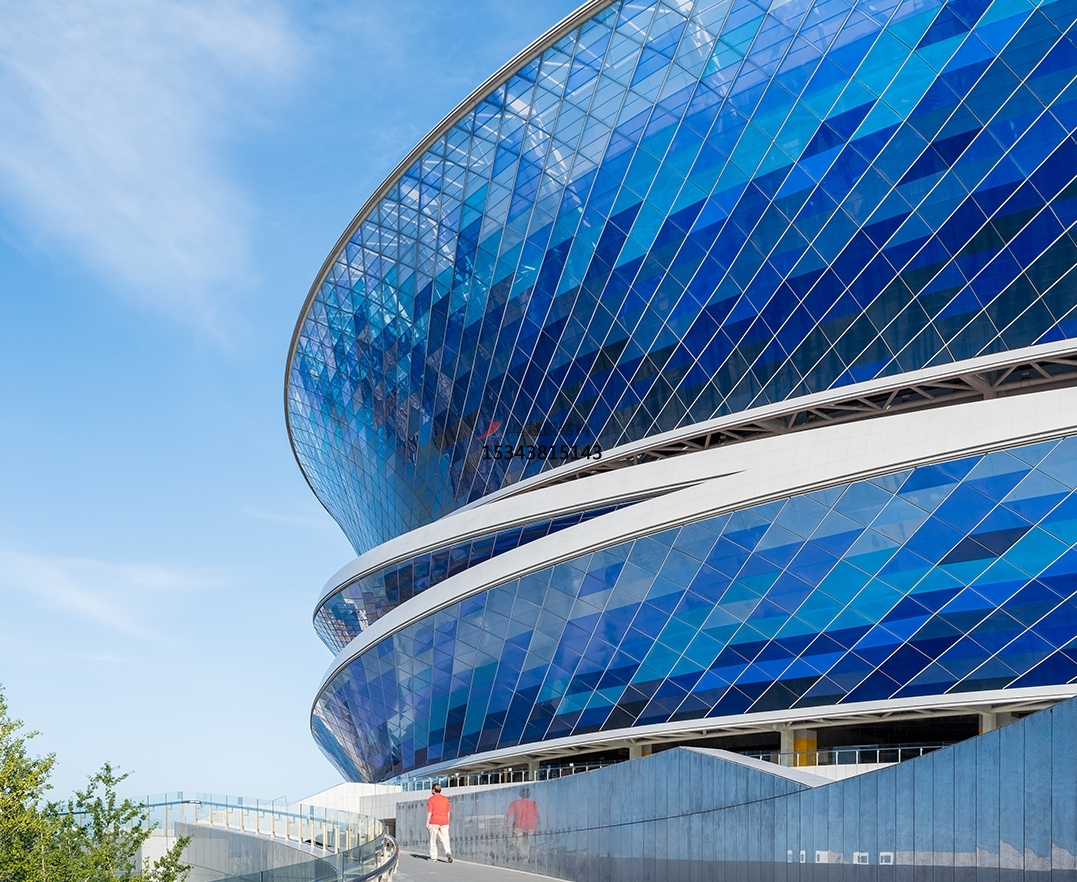 ETFE索膜結構與環(huán)繞索膜泛光照明體系組成。其中,立面采用ETFE膜近4萬平方米,包含9種藍色膜材、7823片膜片,是已知世界專業(yè)足球場膜結構覆蓋面積最大,采用單層ETFE膜結構最多的工程。模材料間設置縫隙,其中較寬縫隙寬度為12厘米,較窄縫隙寬度6厘米,致力于保證立面通風效果(15%)、減小立面風荷載的同時,提高場內空間風熱環(huán)境舒適性。同時縫隙的設置能夠增強消防排煙效能,并提高安裝容錯率。立面構件的工廠化生產(chǎn)及裝配化施工,極大地加快了現(xiàn)場立面吊裝及調試時間。