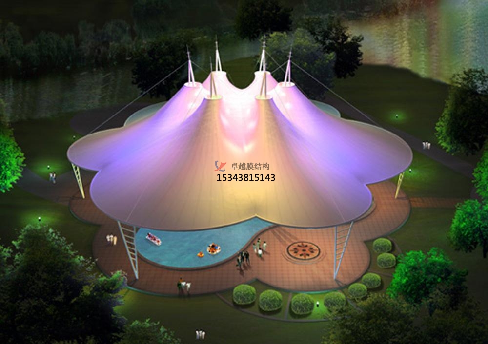 膜結(jié)構(gòu)景觀是一種全新的建筑結(jié)構(gòu)形式,它集建筑學(xué)、結(jié)構(gòu)力學(xué)、精細(xì)化工與材料科學(xué)、計(jì)算機(jī)技術(shù)等為一體,具有很高技術(shù)含量。其曲面可以隨著建筑師的設(shè)計(jì)需要任意變化,結(jié)合整體環(huán)境,建造出標(biāo)志性的形象工程。