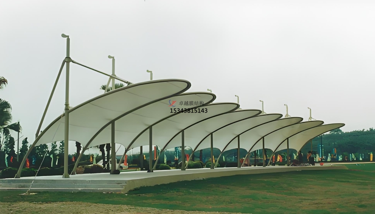 3、五彩斑斕的色彩景象:膜材料是透光的,顏色上有多種選擇,能透射、散射及折射自然光。白天正常的透射比在10%到20%之間,無需額外照明采光;夜間在燈光的照射下,又能提供五彩斑斕的夜間景象。 耐溫、4、耐腐及自潔性好:膜材料能在-20到70度之間工作,能在鹽堿的環(huán)境中正常工作,并有一定的自潔性能,膜面能在雨水及人工淋水的情況下保持自身的清潔。