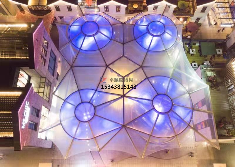 膜結(jié)構(gòu)以高強度柔性薄膜(如ETFE、PVDF)為核心材料,結(jié)合鋼索、桁架等支撐體系,形成兼具輕量化與高穩(wěn)定性的空間曲面12。其自重僅為傳統(tǒng)鋼構(gòu)的1/3,大幅降低基礎造價,同時支持50米以上無柱大跨度設計,為商業(yè)廣場創(chuàng)造開闊通透的公共空間。ETFE氣枕膜通過多層鍍點設計,可智能調(diào)節(jié)透光率與紫外線過濾效率,例如嘉興長安里商業(yè)街的天幕結(jié)構(gòu),既能實現(xiàn)光線漫射營造柔和氛圍,又能有效阻隔70%以上的紫外線輻射。