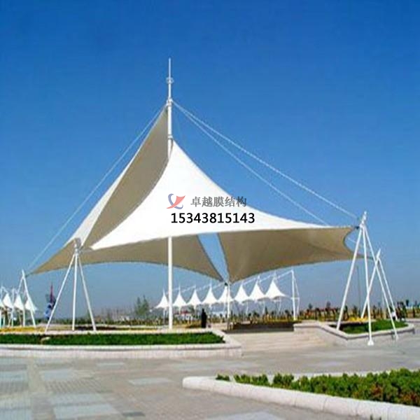 膜結構景觀的篷布采用PVC/PVDF/PTFE/ETFE,而膜材的特點是強度高、耐久性好、防火難燃、自潔性好,不受紫外線影響,使用壽命長,一般15-30年。具有高透光率,透光率為13%,對熱能反射率73%,熱吸收量很少。正是因為這種劃時代的膜材料的發(fā)明,使膜結構景觀成為現(xiàn)代化的建筑。
