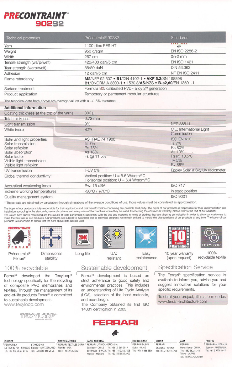 法拉利膜材十多年來(lái),法拉利(PVDF)表面處理的復(fù)合膜材被應(yīng)用在全世界重要的織物建筑工程中。現(xiàn)在,第代膜材再次確認(rèn)了這一出眾材料性能的更新發(fā)展。法拉利研發(fā)了第代材料正是為了滿足建筑師和業(yè)主在新世紀(jì)之初對(duì)于織物建筑提出的要求。這一 全新的膜材得益于更新的科研技術(shù),即將PVDF和硬化介體完美地結(jié)合。這種特殊的結(jié)合明顯地提高了材料的機(jī)械強(qiáng)度、使用壽命,并能長(zhǎng)期保持織物建筑的原始 美觀。第代膜材在積累了10多年的經(jīng)驗(yàn)的基礎(chǔ)上,可以提供專業(yè)保證。法拉利現(xiàn)在能夠根據(jù)要求和每個(gè)項(xiàng)目的具體情況,提供12年質(zhì)量保證 (PRECONTRAINT702除外)。