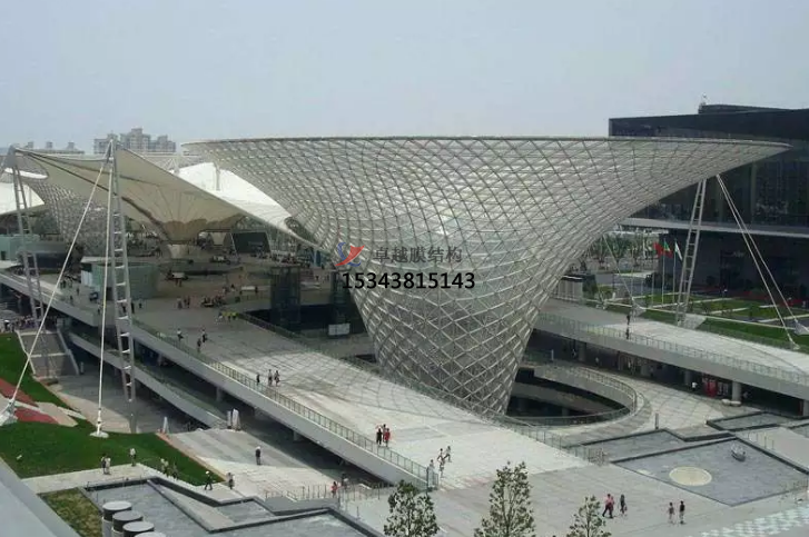 上海世博會(huì)世博軸膜結(jié)構(gòu)陽光谷。位于世博浦東園區(qū)的中心區(qū)域,南北長1045米,東西寬約110米,整體高40多米。作為到達(dá)世博主要場館的主入口,它起到了關(guān)鍵的引導(dǎo)交通和人流的作用。世博軸縱向設(shè)置了6個(gè)巨型圓錐體井狀采光結(jié)構(gòu)的“陽光谷”。世博軸外周設(shè)置了31根梭形柱,每根梭形柱至少設(shè)置了兩根拉地索。內(nèi)部還設(shè)置了19根桅桿柱,內(nèi)外柱子之間都通過高強(qiáng)鋼索相互連接。世博軸膜結(jié)構(gòu)采用Sheerfill I膜,共有69片單元,展開面積達(dá)68000平方米,更大的單片膜面積為1780平方米,相當(dāng)于4個(gè)標(biāo)準(zhǔn)籃球場,這些在世界建筑史上都是獨(dú)樹一幟的。從美觀角度考慮,在帽環(huán)處,局部采用雙層膜,整個(gè)建筑像一朵玻璃的喇叭花從地下悄然綻放,晶瑩剔透。該工程是國內(nèi)更大的全張拉索膜結(jié)構(gòu)工程,創(chuàng)造了膜結(jié)構(gòu)施工的奇跡。