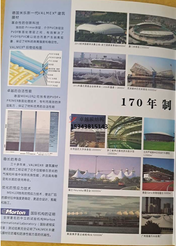 德國MEHLERHAKU米樂公司擁有165年(1837年一2003年)的制造業(yè)經(jīng)驗。通過1S09001質(zhì)量體系認證,所有產(chǎn)品均經(jīng)過嚴格的DIN德國工業(yè)標準,以及各個國家的膜材工業(yè)標準。2002年,德國米樂公司獲聘為中華人民共和國建設(shè)部《索膜建筑結(jié)構(gòu)制品》行業(yè)標準編制委員成員。德國米樂的產(chǎn)品系列涵蓋環(huán)保等各種PVC膜材領(lǐng)域,包括:建筑工程、輕型結(jié)構(gòu)、廣告、遮陽、汽艇、軍用、裝飾、水利環(huán)保,等等。