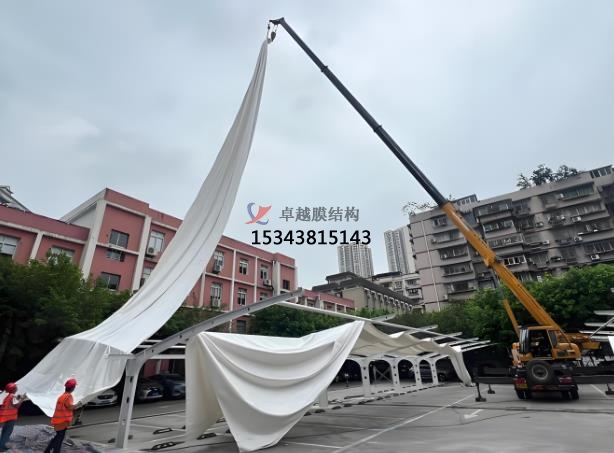 安裝過(guò)程:安裝過(guò)程分別是鋼結(jié)構(gòu)的安裝,膜材的安裝和附件安裝。鋼結(jié)構(gòu)的安裝會(huì)根據(jù)設(shè)計(jì)要求進(jìn)行鋼結(jié)構(gòu)基礎(chǔ)的施工,確?;A(chǔ)的尺寸、位置、標(biāo)高符合設(shè)計(jì)要求,做到表面光滑、無(wú)變形、無(wú)損傷。鋼結(jié)構(gòu)的安裝位置必須準(zhǔn)確,將鋼結(jié)構(gòu)構(gòu)件在地面進(jìn)行預(yù)組裝,檢查各構(gòu)件的連接是否準(zhǔn)確、牢固,使用專業(yè)的吊裝設(shè)備,如起重機(jī)等,按照預(yù)定的吊裝方案進(jìn)行操作,確保鋼結(jié)構(gòu)的安裝位置準(zhǔn)確。要隨時(shí)進(jìn)行測(cè)量和調(diào)整,保證鋼結(jié)構(gòu)的垂直度、水平度和跨度等符合設(shè)計(jì)要求。采用焊接、螺栓連接等方式將鋼結(jié)構(gòu)構(gòu)件連接固定,確保連接的強(qiáng)度和可靠性。焊接時(shí),要嚴(yán)格控制焊接質(zhì)量,避免出現(xiàn)焊接缺陷。膜材的安裝過(guò)程,膜面的尺寸和形狀必須符合設(shè)計(jì)要求,表面干凈、無(wú)損傷。膜材在安裝現(xiàn)場(chǎng)按照預(yù)定的方向和位置展開(kāi),同時(shí)應(yīng)注意避免膜材與地面或其他物體摩擦、劃傷。使用專用的夾具或繩索將膜材固定在鋼結(jié)構(gòu)上,初步調(diào)整膜材的位置,使其與鋼結(jié)構(gòu)的連接點(diǎn)對(duì)齊。進(jìn)行逐步且均衡的膜面張拉,張拉過(guò)程要均勻、緩慢地進(jìn)行,施加適當(dāng)?shù)念A(yù)張力,同時(shí)要根據(jù)膜材的實(shí)際情況,對(duì)張拉力進(jìn)行適當(dāng)?shù)恼{(diào)整,保證膜材表面平整、光滑,無(wú)褶皺、松弛等現(xiàn)象,使其達(dá)到設(shè)計(jì)要求。在膜材張拉到位后,使用專用的固定件將膜材牢固地固定在鋼結(jié)構(gòu)上。固定件的間距和安裝方式要符合設(shè)計(jì)要求,確保膜材在使用過(guò)程中不會(huì)出現(xiàn)松動(dòng)或位移。附件安裝,附件的安裝包括排水系統(tǒng)安裝,遮陽(yáng)設(shè)施安裝和安全設(shè)施安裝。安裝膜結(jié)構(gòu)的排水槽、落水口等排水設(shè)施,確保雨水能夠順利排出,避免在膜面形成積水。排水系統(tǒng)的安裝要保證密封性和排水順暢性。如果膜結(jié)構(gòu)設(shè)計(jì)有遮陽(yáng)要求,安裝相應(yīng)的遮陽(yáng)簾、遮陽(yáng)網(wǎng)等遮陽(yáng)設(shè)施。遮陽(yáng)設(shè)施的安裝要牢固可靠,能夠滿足遮陽(yáng)和使用功能的要求。安裝必要的安全設(shè)施,如欄桿、安全網(wǎng)等,確保人員在膜結(jié)構(gòu)區(qū)域內(nèi)的安全。