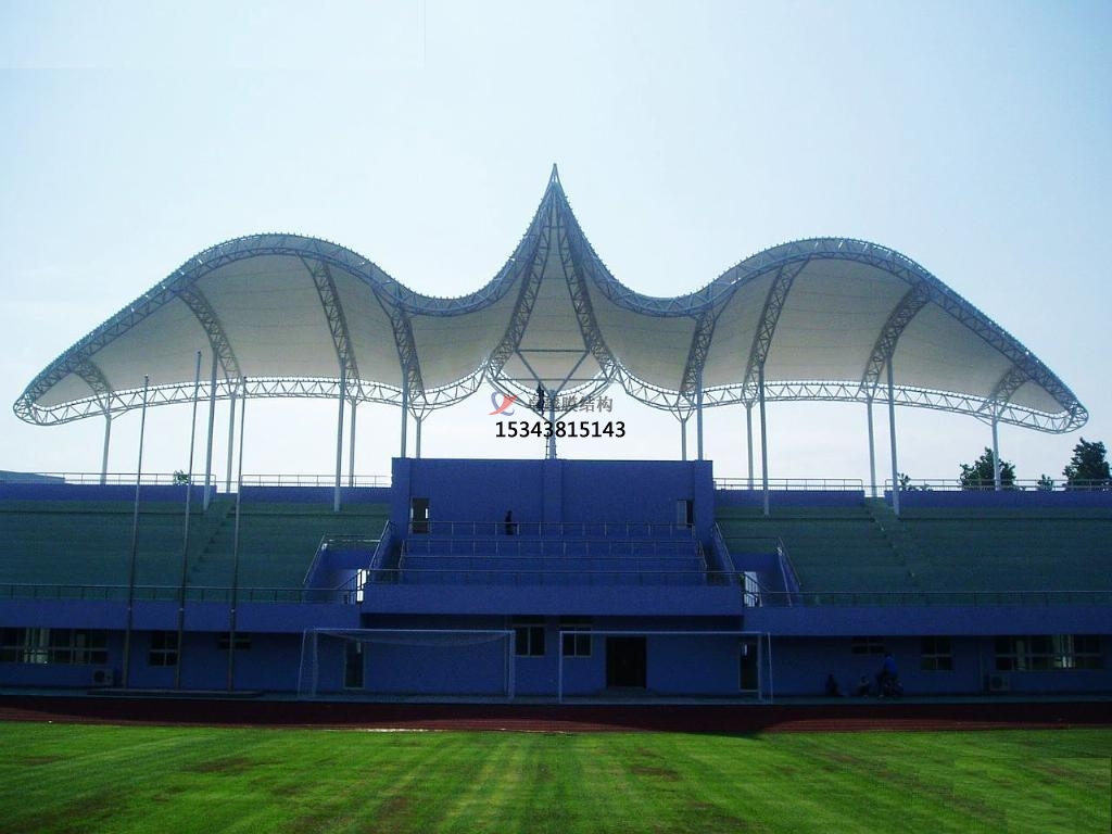膜結構看臺在體育設施上主要應用在學校操場運動看臺或主席臺屋頂,另外大型體育場館看臺膜結構屋頂也屢見不鮮??磁_造型般由貝殼形峰膜及部張拉膜組成,形式新穎活潑。膜結構看臺將鋼架、索、膜巧妙結合,通過薄膜、膜邊索、脊索、谷索、拉索、拉桿及定的格構梁來穩(wěn)定。膜頂平滑過渡,結構美觀、輕巧、整體造型相互輝映,別具格。