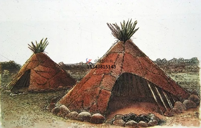 膜結(jié)構(gòu)作為一種空間結(jié)構(gòu)形式,最早可以追溯到遠(yuǎn)古,人類用木頭搭建結(jié)構(gòu)骨架,覆蓋上獸皮或草席,用繩子或石塊固定在地上,建成簡(jiǎn)易的房子