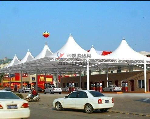 項目結構形式:骨架式膜結構加油站加氣站,四面自然排水,一側與站房搭接。