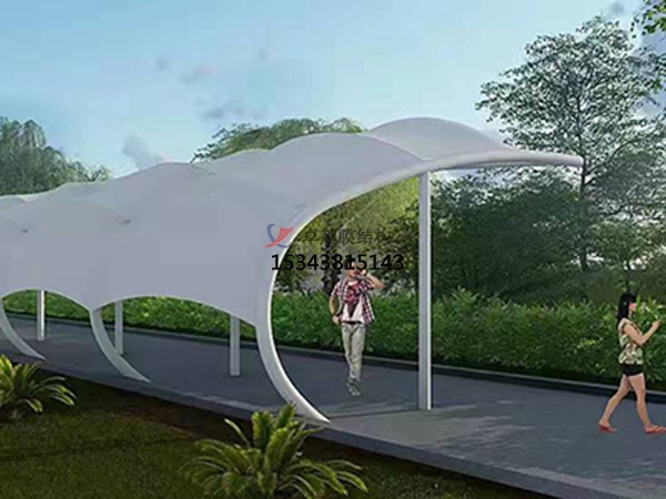 1.景觀價值。車棚屬于小型建筑,其造型備受人們關(guān)注。鋼結(jié)構(gòu)車棚因鋼材的特殊性,造型較為單一。而膜結(jié)構(gòu)車棚主材有膜材,曲線性高,可根據(jù)設(shè)計師的想象,隨意造型。