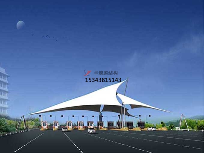 二、收費站頂棚并不是傳統(tǒng)意義上的一個遮陽擋雨的覆蓋頂棚,隨著人們審美的不斷提高,除了要求頂棚具有實用性功能外,還要有一定的美觀性,因此,在充分發(fā)揮膜布的性能條件下,搭配先進的張拉技術(shù),可以將頂棚張拉成不同的形狀,使收費站更具有藝術(shù)美感。