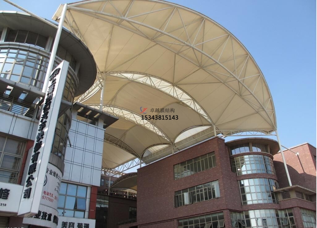 特點:商業(yè)街膜結(jié)構(gòu)穹頂天幕特點:透光性好、材質(zhì)輕、適合大跨度,可以完美取代傳統(tǒng)的穹頂材料,而且使用壽命更長、自潔性更佳、安全性更高。
