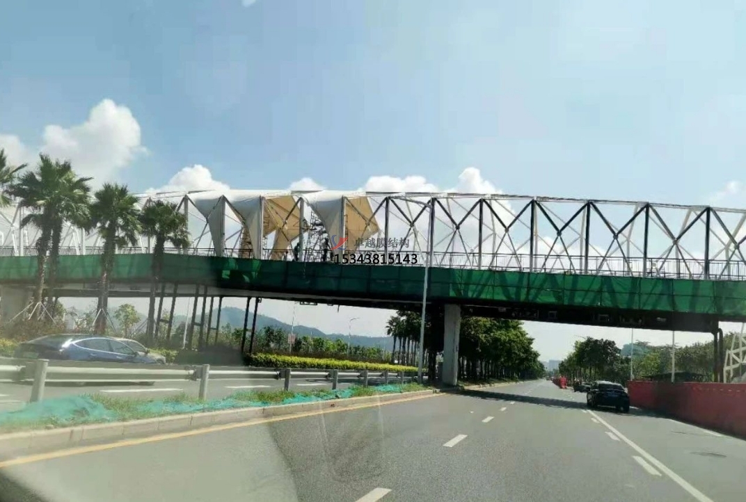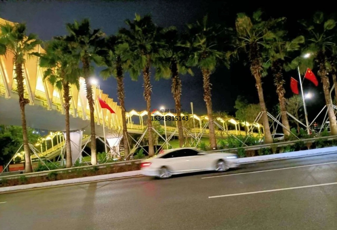 為了保質(zhì)、保量、保證工期、保安全的情況下順利的把項目交到業(yè)主手中,把施工人員分成兩班晝夜不分,日夜加班,還要克服現(xiàn)場的高溫,施工節(jié)點的困難,而且每片膜材的尺寸也不相同,為了膜材裁剪精準(zhǔn),設(shè)計師每跨每跨的量尺寸,又復(fù)合尺寸,確保了天橋立面膜結(jié)構(gòu)的安裝工程順利進(jìn)行。