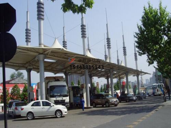 張拉式膜結(jié)構(gòu),以膜材,鋼索及支柱構(gòu)成,運(yùn)用鋼索與支柱在膜材中導(dǎo)入張力以達(dá)安靖的方法,除了可實(shí)踐具有構(gòu)思,立異且美麗的造型外也是能展現(xiàn)膜結(jié)構(gòu)精力的結(jié)構(gòu)方法,近年雨棚來,大型跨距空間也多選用以鋼索與緊縮材料構(gòu)成鋼索網(wǎng)來支撐上部膜材的方法,加氣站雨棚施工精度要求高,結(jié)構(gòu)功用強(qiáng),且具豐盛的表現(xiàn)力。