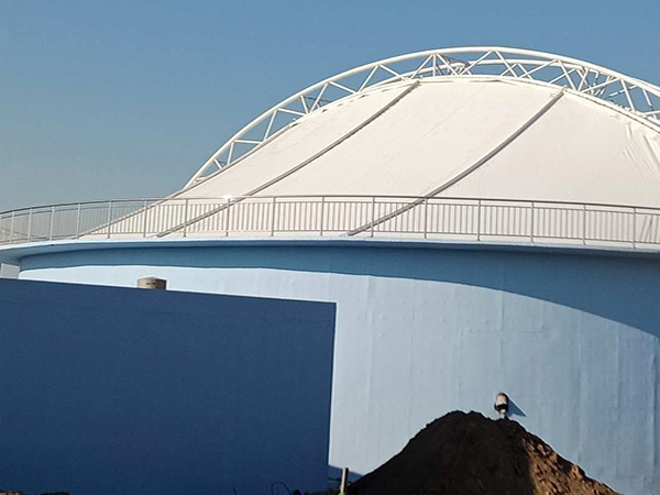 吐魯番卓越膜結構工程公司是集污水池加蓋反吊膜加蓋工程設計施工、結構設計、靜動力計算分析、整體結構安裝以及使用維護于一體的綜合性工程公司。污水池反吊膜結構中的高強度柔韌薄膜稱膜材,它是一種耐腐蝕、耐高溫、耐久用、高強度的樹脂類涂層織物,由多種復合PVC樹脂涂層刀刮成型,具有質地柔韌、厚度小、重量輕、透光性好的特點。對自然光吸收和透射能力、阻燃,具有良好的耐久、防火、氣密等特性;表面經過特氟龍?zhí)幚砘蚨趸伩估匣幚恚哂休^高的自清潔性能。下面就大家介紹一下我公司在吐魯番地區(qū)完成的部分污水池膜結構封閉項目。