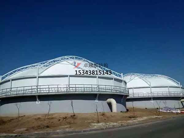2、我公司利用膜結(jié)構(gòu)的輕巧,別致的造型建造各種半封閉,全封閉的不行空間;污水池反吊膜結(jié)構(gòu)中的高強(qiáng)度柔韌薄膜稱膜材,它是一種耐腐蝕、耐高溫、耐久用、高強(qiáng)度的樹脂類涂層織物,由多種復(fù)合PVC樹脂涂層刀刮成型,具有質(zhì)地柔韌、厚度小、重量輕、透光性好的特點。對自然光吸收和透射能力、阻燃,具有良好的耐久、防火、氣密等特性;表面經(jīng)過特氟龍?zhí)幚砘蚨趸伩估匣幚?,具有較高的自清潔性能。下面就大家介紹一下我公司在泰安市地區(qū)完成的部分污水池膜結(jié)構(gòu)封閉項目。