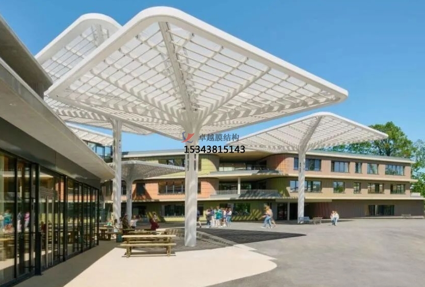 膜結(jié)構(gòu)景觀可以采用多種形狀和顏色的膜材料,通過張力和支撐系統(tǒng)來實(shí)現(xiàn)懸掛和張拉的效果,其設(shè)計(jì)靈感來自于自然界中的形態(tài)和結(jié)構(gòu),如植物葉片、動(dòng)物骨骼等,常見的應(yīng)用包括遮陽棚、入口門廊、地標(biāo)建筑等等。