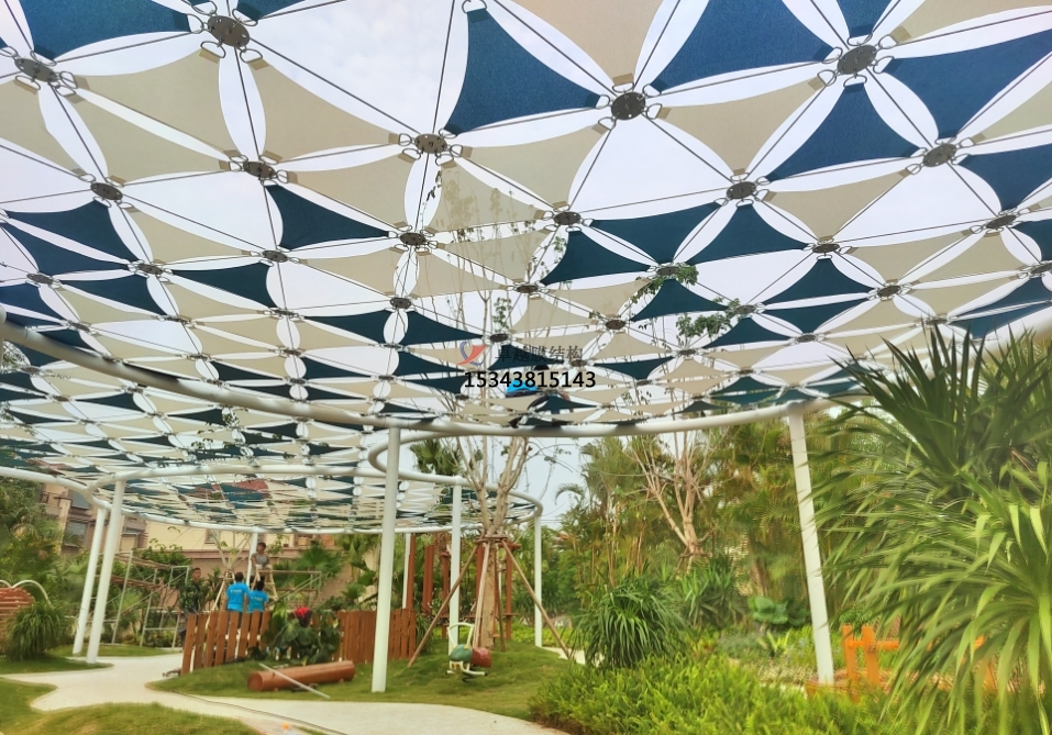 膜結(jié)構(gòu)景觀的材料和設(shè)計(jì)特點(diǎn)使得它具備良好的隔熱性能。在夏季,它可以減少太陽輻射的進(jìn)入,降低室內(nèi)溫度,減輕空調(diào)負(fù)荷。在冬季,它可以保持室內(nèi)熱量,減少能源消耗;而且相對于傳統(tǒng)建筑物,膜結(jié)構(gòu)景觀的施工周期較短。膜材料的制作和安裝相對簡便,可以在較短的時(shí)間內(nèi)完成建設(shè),減少施工對周邊環(huán)境的干擾。除此之外,因?yàn)槟そY(jié)構(gòu)景觀還具有很高的抗拉強(qiáng)度和耐候性能,能夠承受風(fēng)力和其他天氣因素的沖擊,通過支撐結(jié)構(gòu)和張拉系統(tǒng)的精心設(shè)計(jì),能夠在惡劣天氣條件下保持穩(wěn)定,具有良好的抗風(fēng)能力,減少對風(fēng)的阻力,減輕膜材料的受力。另外,膜材料本身具有優(yōu)異的防水性能,能夠有效地防止雨水滲透,而且膜結(jié)構(gòu)景觀的設(shè)計(jì)通??紤]到排水系統(tǒng),可以迅速將雨水導(dǎo)出,避免積水對結(jié)構(gòu)和材料造成損害。