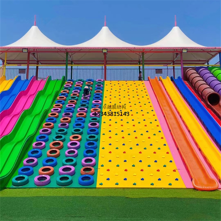 運城彩虹滑道新款張拉膜遮陽棚定制需要考慮多個因素,包括滑道的長度、寬度、坡度、材料選擇、安全性、美觀性等。以下是一些定制遮陽棚的建議: