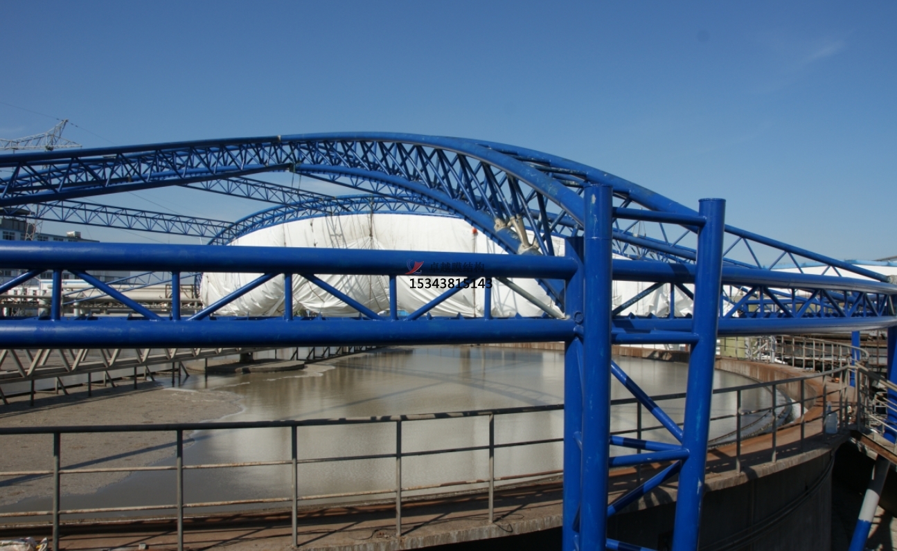 污水池反吊膜,顧名思義,是一種將薄膜材料以反吊的方式覆蓋在污水池上方的結(jié)構(gòu)。這種結(jié)構(gòu)通過鋼架或索網(wǎng)等支撐體系,將膜材料緊繃并固定于污水池上方,形成一個密閉或半密閉的空間,有效隔絕污水池內(nèi)的惡臭氣體和有害物質(zhì),防止其對外擴散,同時保護膜材料免受污水池內(nèi)腐蝕性氣體的侵蝕。